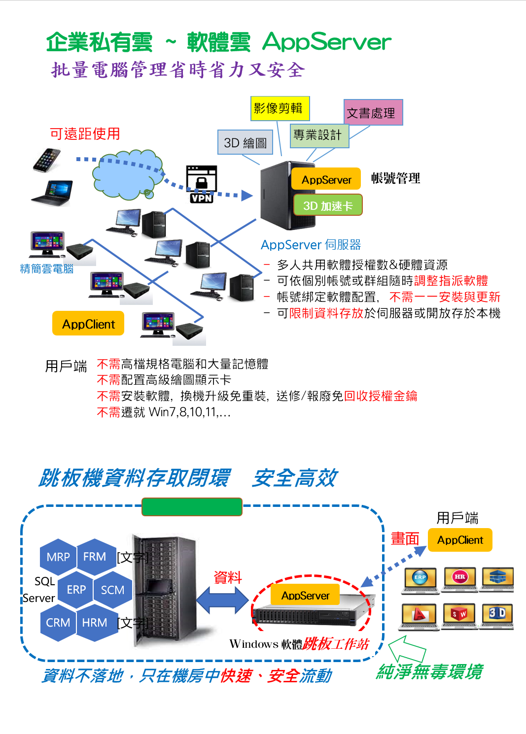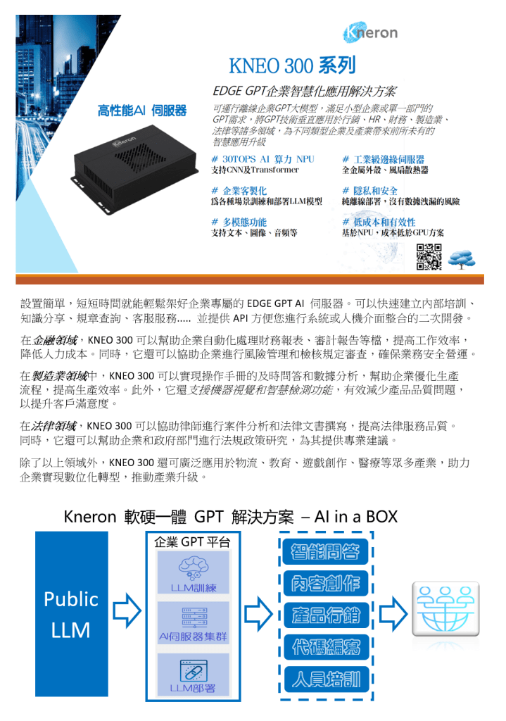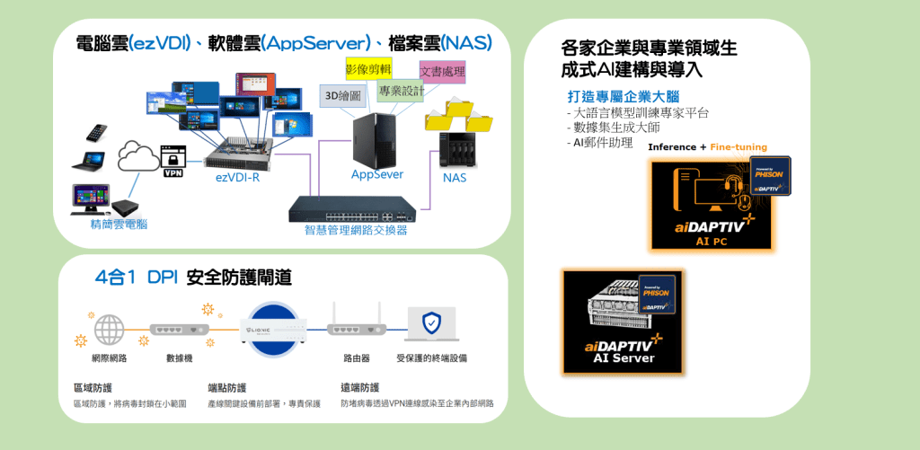 首頁 中小企業數位轉型私有雲 運用 20 年經驗精心選擇與測試的中小企業雲端軟體方案,為客戶提供最實惠適用的規劃、安裝及售後服務。 與我們聯絡 「數位轉型」與「ESG永續綠色」雙效合一的雙軸轉型 人員分流異地工作的最佳方案,MIS可遠端好管理,用戶電腦精簡化、節能減廢。滿足資安,降低維護成本與停機風險,使IT人力更專注核心業務。 可限制同時使用人數,憑帳號管理使用軟體權限。不用逐一安裝、不用逐一更新。用戶端電腦配備可降規節省費用。 不只是文件儲存/共享管理,2.5/5GB高速存取、SSD快取、彈性擴充,降低等待不塞車。 防毒、防駭、防惡意網站、防火牆不用更改原來網路架構和設定,3分鐘3步驟完成設定,網內所有裝置全都受到防護。還能降低電腦負擔。不必每台都電腦安裝/更新防毒軟體; 不只電腦,所有網路設備都受到防護 降低學校&企業進入AI的第一道門檻,建立專屬地端生成式AI KMS包含:– aiDAPTIV+ Pro Suite 大語言模型訓練專家平台– aiDAPTIV+ Guru 數據集生成大師– aiDAPTIV+ Inbox AI郵件助理 Kneron KNEO 300/330 Series AI Edge GPT Server 企業化Ready-to-go解決方案具有 48 TOPS 的 AI 運算能力,最多 8 個並發連接,支援大型語言模型和穩定擴散,功耗僅為約 20 瓦。 No Code企業電子化工具 即將上線! 電腦慢讓工作的心情不美麗,思緒易中斷, 卡頓的原因常被誤以為是CPU速度不夠快,其實硬碟才是瓶頸。救援和停機的費用還比不上資料和商機流失。 DIY自製自播大尺寸多媒體廣告門檻大幅降低 ! 生動吸睛的多媒體內容,自己就能輕鬆製作, 即時宣傳. 用途多元: 室內/街角廣告、企業形象、公佈欄 ……。 深入瞭解我們 我們商品與服務的相關數據 每月為 220 個企業服務 7 位專家持續貢獻心力 曾贏得 3 項大獎 100% 顧客滿意度 DM瀏覽 ⭐⭐⭐⭐⭐ 評分:5 分,滿分為 5。 「卓越服務」 他們的服務真是太棒了!我真希望同業也能開始改用你們的服務。 某聯合室內設計事務所 ⭐⭐⭐⭐⭐ 評分:5 分,滿分為 5。 「到位服務令人滿意」 我們對新建置的全雲端化系統大為讚賞,也很滿意能簡易管理或提供清晰維護文件的服務。 某中小企業IT組長 ⭐⭐⭐⭐ 評分:4 分,滿分為 5。 「絕佳品質」 我非常滿意產品的品質和介面。這些產品真的非常好用。 北部某經銷夥伴 體驗我們的商品 歡迎洽詢實機展示或線上試用帳號 資安健檢服務 包含弱點掃描, 滲透測試, 源碼掃描安全檢測, 社交工程演練 具規模企業(*上市櫃公司)應⼀年1~2次, 或於… 2024 年 10 月 05 日2024 年 10 月 05 日 防疫數位系列 三雲融合消除傳統電腦困擾 現在就是轉換電腦雲的最佳時機。無縫轉換雲端系統讓您不管出差或在家工作,都能以最低的資… 2021 年 05 月 22 日2024 年 08 月 16 日 快速線上留言 分享此文: 按一下即可分享至 X(在新視窗中開啟) X 按一下以分享至 Facebook(在新視窗中開啟) Facebook