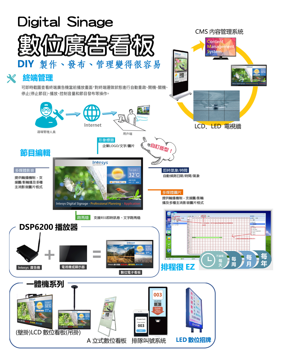 Intesys DSP6200 播放器 搭配簡易使用的CMS廣告版面編輯與播放管理軟體. 螢幕可自行購買或來電洽詢。